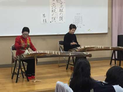 お茶体験に続いて、琴の音色のふれました。本物の琴を間近に聴くのは、初めてだという子どもが大半です。優美な響きに聴き入っていました。