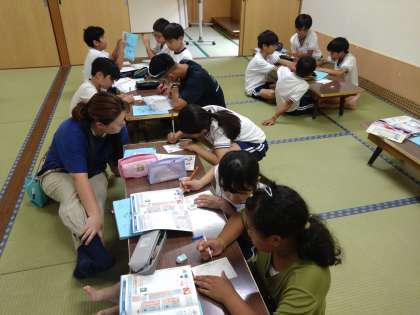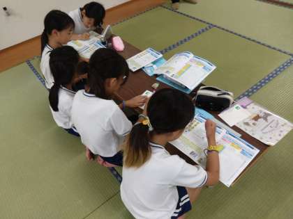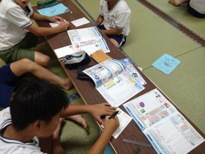 家族にはがきを書いています。今日の楽しかったことや明日からの楽しみなどを書いていました。郵便事情で家にはがきが着くのは林間学習後になりますが、楽しみにしてください。