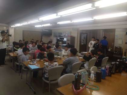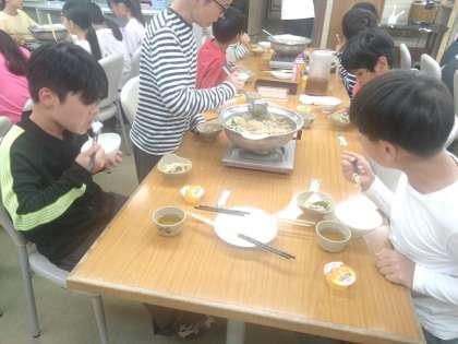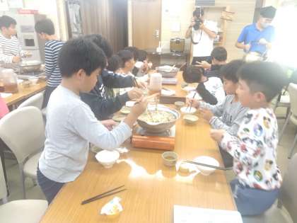 いよいよ「いただきます」です。みんなおいしそうに楽しく食べています。