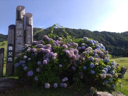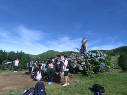 モニュメントで記念撮影です。暑いです。がんばってます。「ヤッホー」と声を出しています。