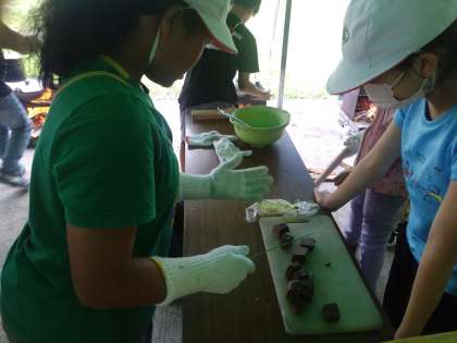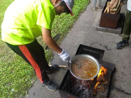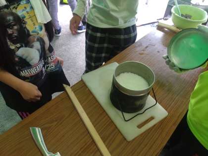 ご飯が炊き上がりました。カレーノルーを切り、鍋で煮込みます。おいしいにおいがしてきました。