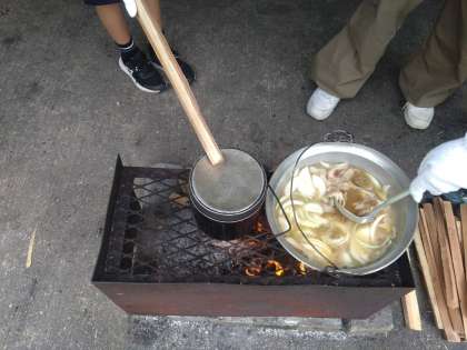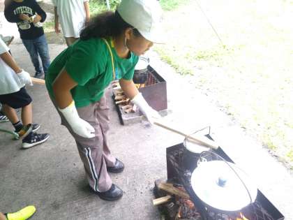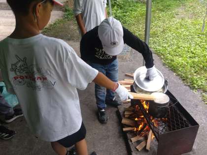 各グループも最終仕上げです。飯盒の蓋に薪を当てて炊き具合を確認しています。