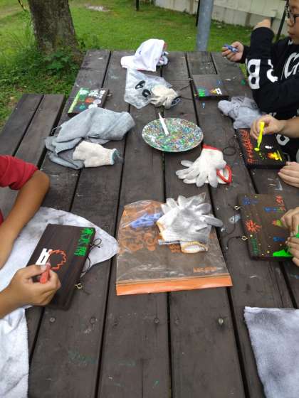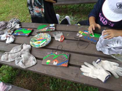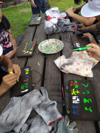 林間学習の文字、山の駅、キャンプファイヤーの絵など、楽しい思い出をかいていました。