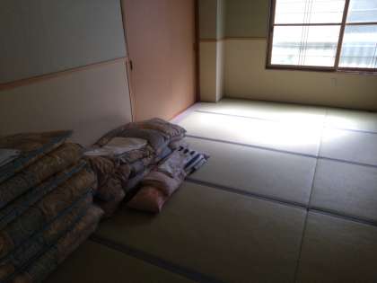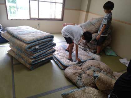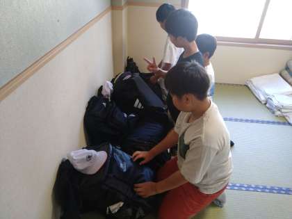 部屋の片付けをきちんと済ませ、寝具をたたみます。帰る荷物も準備OKです。次は体育館でアイスクリーム作りです。