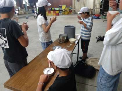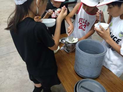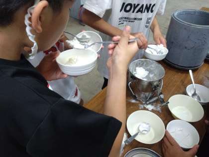 できたアイスクリームをグループで分け合って食べます。みんな嬉しい顔です。
