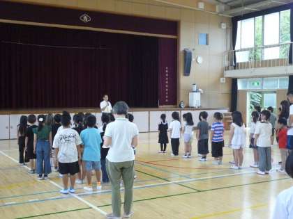 子どもたちは元気に講堂に集まり、静かに話を聞き、大きな声で校歌を歌っていました。