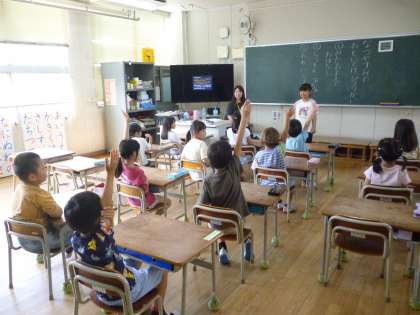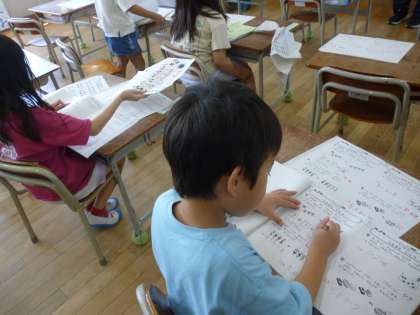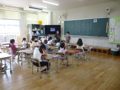1年生は夏休みの思い出を一人ずつ、発表していきました。発表後はみんなからの質問を受けて、うれしそうに答えていました。夏休みの宿題は自分で答え合わせをすることができました。