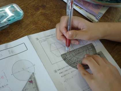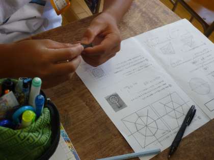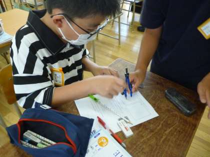 6年生は算数で正六角形をかきました。コンパスで円をかき、分度器で角度を測っていきました。友達にアドバイスをもらっていました。