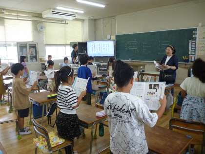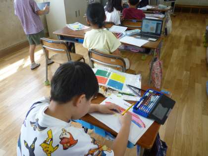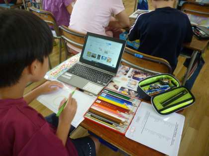 2年生は工作でを使うため絵のデザインを描きました。インターネットで調べ、ていねいに描いていきました。歌の練習ではとてもきれいな声で校歌を歌っていました。