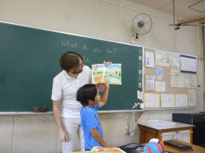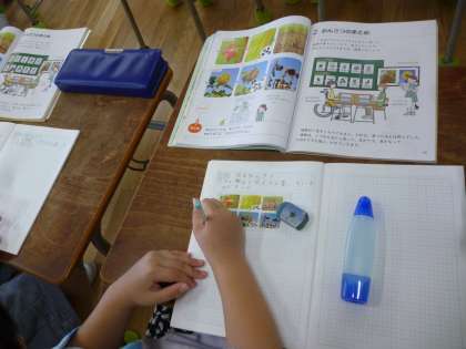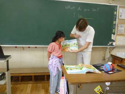 3年生は英語の学習で教科書の虹の絵に好きな色を塗り、その好きな色をみんなの前で英語で発表しました。堂々と英語で言って自信を深めていました。