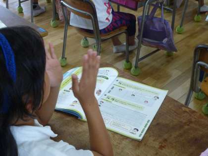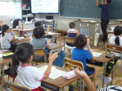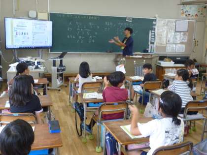 2年生は音楽で動物の鳴き声に合わせて手拍子をとりました。例えば犬なら「ワン、ワン」と手を2回たたきます。楽しくリズムをとっていました。
