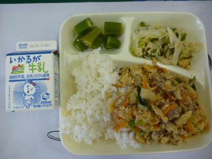9月4日の給食は「他人丼」「ささみと野菜のいためもの」「オクラの甘酢和え」です。他人丼は具によい味がついており、ご飯によく合っていてとてもおいしかったです。
