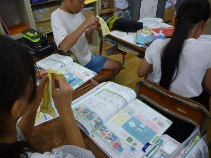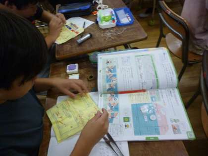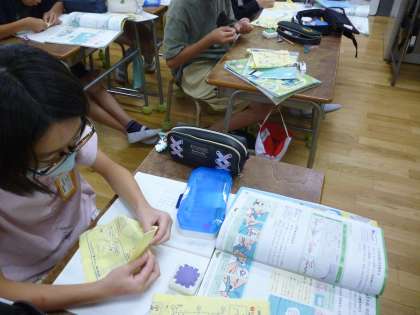 5年生は家庭科でボタン付けをしました。練習布に慎重に針と糸でつけていました。慣れないのでなかなかむずかしそうでした。