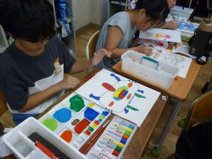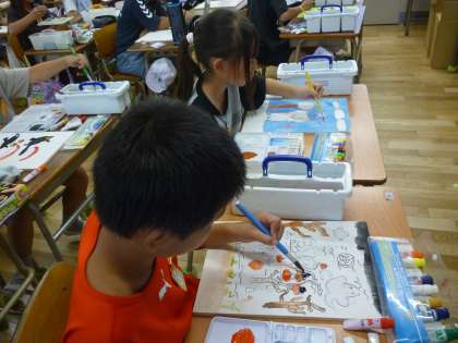 すでにお知らせしていますが4年生は工作でコリントゲームを作っています。昨日は枠の棒に色を塗っていきましたが、今日は本体に絵を描いていきました。