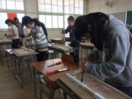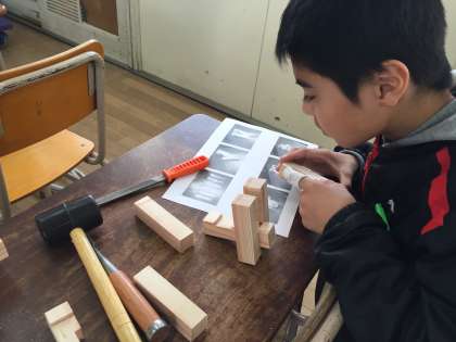 角材にくぼみを作り、木と木を組み合わせていきました。伝統的な宮大工の技能を学びました。
