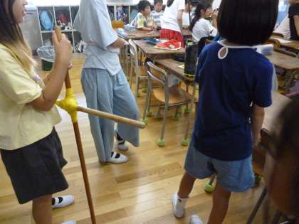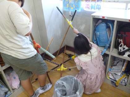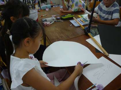 5年生はかかしを作りました。設計の絵をみんなで考え、木の枠に画用紙を切って貼っていきました。完成すると住吉大社の御田に飾ってもらいます。