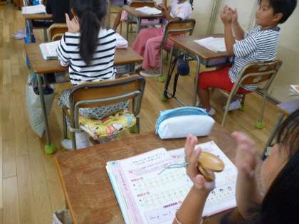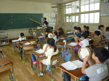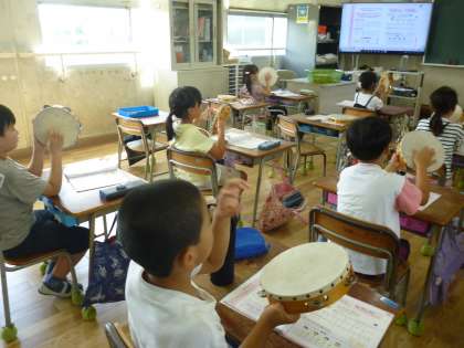 2年生は「この空、とぼう」の曲に合わせてカスタネットとタンバリンを演奏しました。曲をしっかりと聞き、正確にたたいていました。歌と打楽器のパートに分かれて練習もしました。