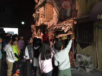 119番通報の仕方、地震後の街の歩き方などを学びました。実際の町並みを再現してあるので、子どもたちも緊張しながら歩いていました。