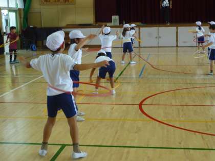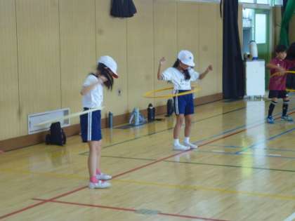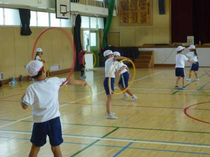 2年生は体育でフラフープを使った運動をしました。腰で回したり、腕にかけて回したりと暑さに負けずに運動していました。