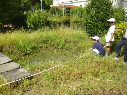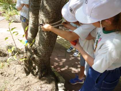 3年生は算数で巻き尺を使って校内のいろいろな場所の長さを測っていきました。廊下など長い場所、学習園の池、バスケットボールや木の幹の周りなど校内を動きながら測定していきました。直線だけでなく木の幹など、今まで使っていたものさしでは測ることができないところも測ることができることにも気づきました。