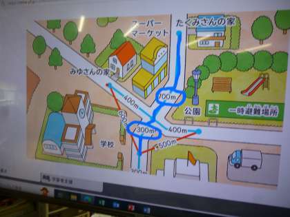3年生は長さの学習で「きょり」と「道のり」の違いを学びました。町のイラストを見ながら「きょり」と「道のり」の説明を聞いて理解しました。また、300m+700m=1000mの計算をし、それが1kmということも学びました。