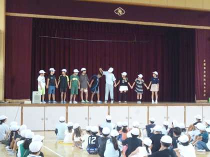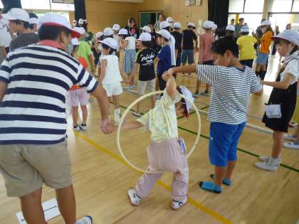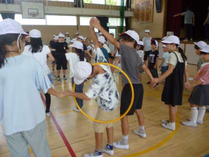 今日の児童集会は「フラフープ送り」ゲームです。集会委員会がゲームのやり方を実現し、縦割りグループで楽しんでいきました。隣同士が協力しないとうまくできないゲームです。