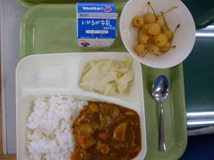 9月19日の給食は「チキンカレーライス」「キャベツとコーンのサラダ」でデザートに缶詰のサクランボが出ました。カレーライスは具が違ってもおいしく、子どもたちは喜んで食べていました。