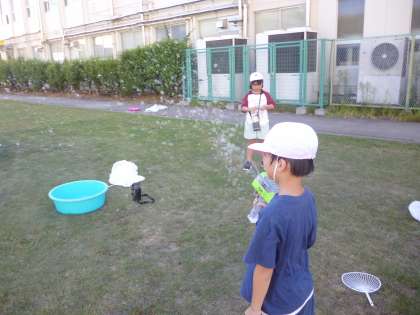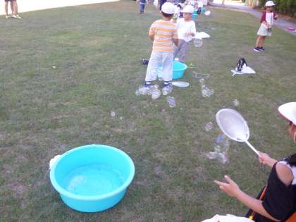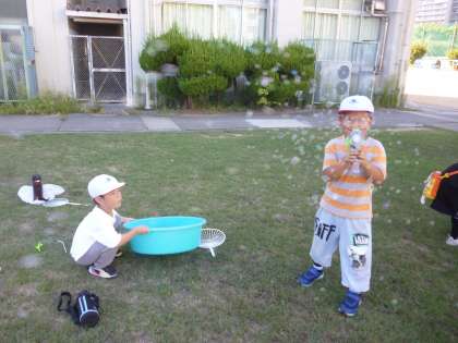 1年生は生活科でシャボン玉遊びをしました。芝生広場にシャボン玉がたくさん浮き上がり、子どもたちはとてもうれしい笑顔で活動していました。