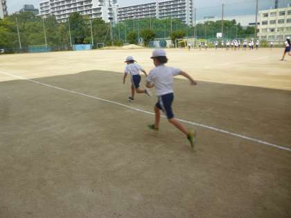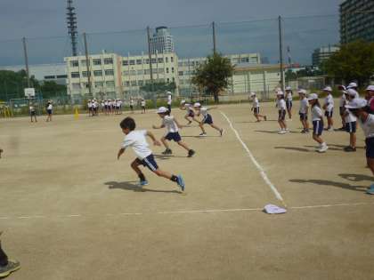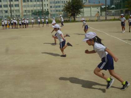 2年生は運動会に向けて速く走る練習をしました。腕の振り方、足の上げ方などを教えてもらい練習をしていきました。みんな真剣な走りです。