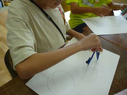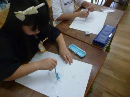 3年生は算数で初めてコンパスを使いました。コンパスの使い方や注意点を教えてもらい、円で模様をかいていきました。はじめてですがうまくかいていました。