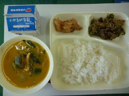 9月25日の給食は「かぼちゃのみそ汁」「なすのそぼろいため」「「鶏肉の照り焼き」です。どの献立もご飯によく合う味で、ご飯が進みました。