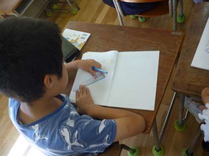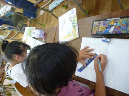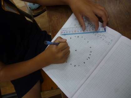 3年生は算数で円の学習をしています。写真のように中心点から5cmを測り、点を打っていきます。それを繰り返すとどのような形(円)になるかを確かめました。そして中心点から定規で測った長さが「半径」でその倍が「直径」ということも教えてもらいました。