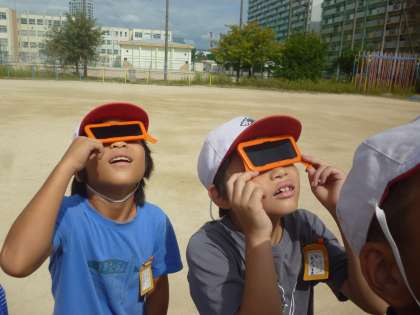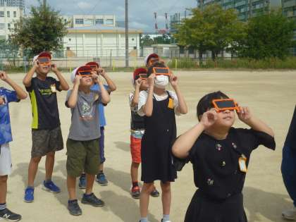 3年生は理科の学習で太陽を見ました。もちろん遮光レンズ(太陽メガネ)を使ってみました。小さいながらはっきりと形や色がわかり、感嘆の声を上げていました。