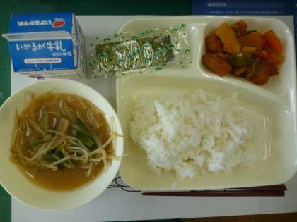 9月27日の給食は「酢豚」「中華みそスープ」「焼きのり」です。スープはもやしがたくさん入っており、シャキシャキした食感がとてもよかったです。