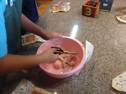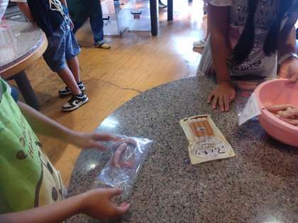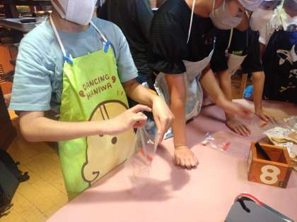 茹でてもらったウインナーをはさみで切って記名した袋に詰めました。ウインナーは明日、冷蔵で学校に配達され、帰りに持って帰ります。