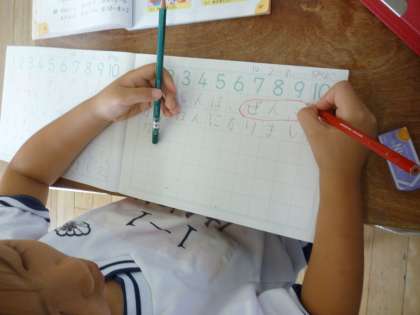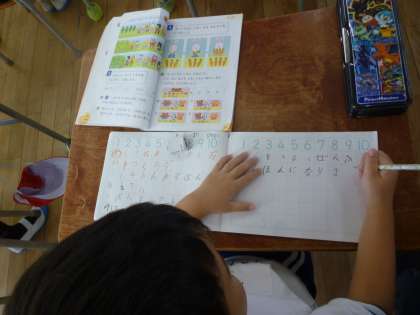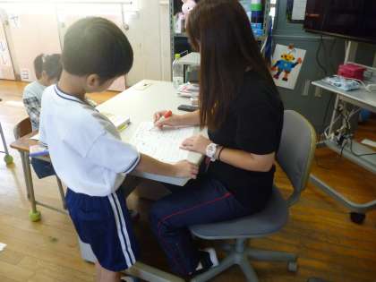 1年生は1+4+3などの3つのたし算になるお話を作りました。理解がはやく、すぐに問題を作って先生に見てもらっていました。