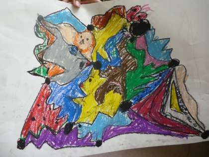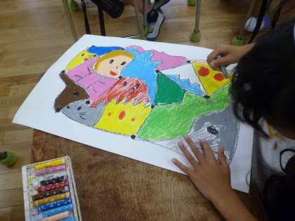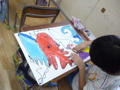 昨日、紹介しました2年生の「かくれんぼ」の絵が完成しました。昨日紹介した点を直線で結んだ間を色を塗っていきます。完成した絵を見ていただくと、動物が隠れているのがお判りでしょうか。これが「かくrんんぼ」なのです。