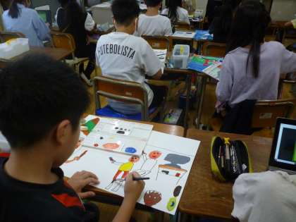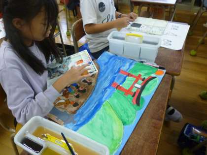 5年生は夏休みの思い出を絵に表しました。よく思い出して絵の具で仕上げていました。