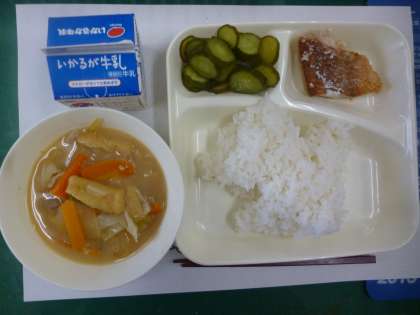 10月4日の給食は「あかうおのしょうゆだれかけ」「豚汁」「きゅうりのゆず風味」です。毎日、給食委員会の児童が給食献立の説明を読んでいます。