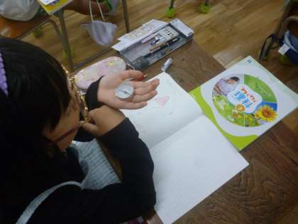 3年生は理科で方位磁石について学びました。赤色の針が北を指すなど、方角を確認しながら学びました。