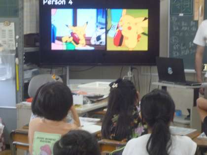 5年生は英語の学習で、写真のように英語で書かれたヒントを見てそのキャラクターを手を挙げて当てました。英語の意味が分かってもキャラクターがわからないことが多いので、頭をひねって考えていました。