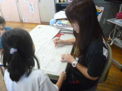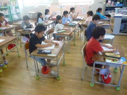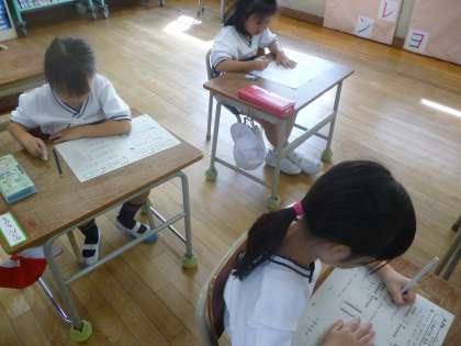 1年生は算数の復習プリントに取り組み、先生に見てもらいました。毎日の運動会に振りけりも順調です。