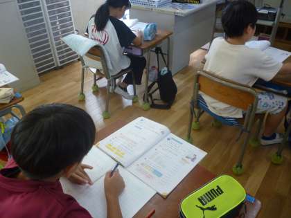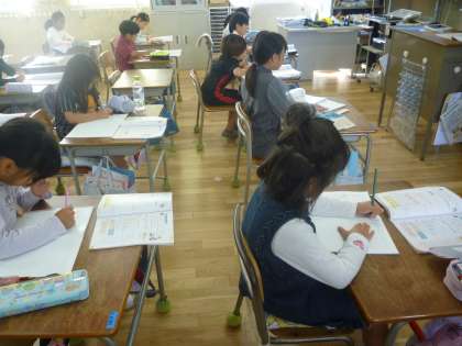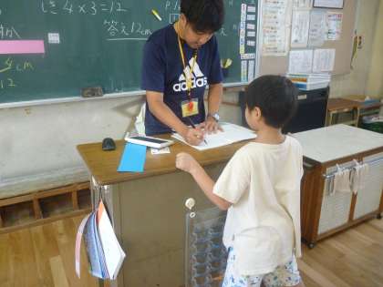 2年生はかけ算の学習を進めています。線分図で「何個分」かを確認して解いていきました。担任はいつもていねいにチェックしています。