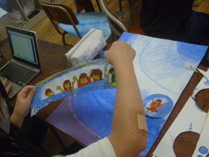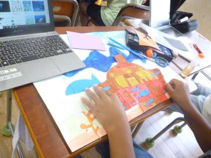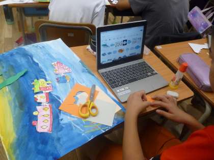 4年生は図工の「未来の海底」の絵の海の部分が出来あがりました。今日は海の中にいる魚などの生き物や電車など想像物を描いて、切り取って貼っていきました。