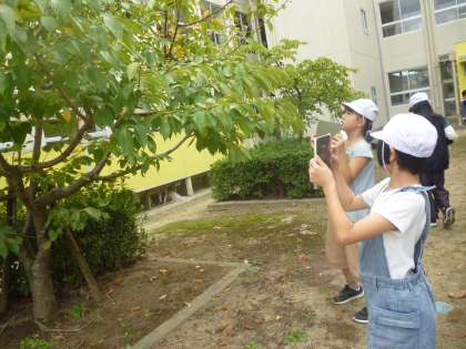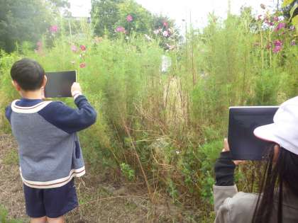 4年生は理科で秋に自然について調べていきました。タブレット端末の写真機能を使って校庭をまわりました。コスモスやコオロギなど、たくさんの秋を見つけ、写真に収めていきました。座っている子はコオロギを撮っています。