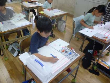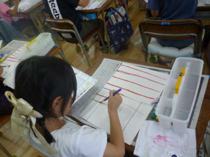 2年生は初めて水彩絵の具を使いました。道具の置き方から水の汲み方、筆の使い方など基本をしっかりと学び、横線を描いていきました。これから絵を描いていくのが楽しみです。