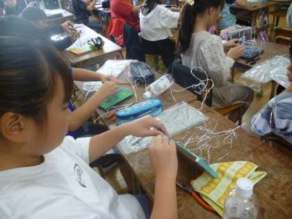 5年生はワイアーアートの土台を作り、いよいよワイアーを組んでいきました。写真のようにペンチも使いながら進めていました。どんな作品ができるか今から楽しみです。