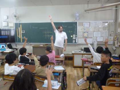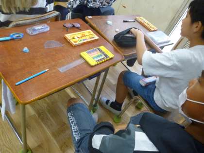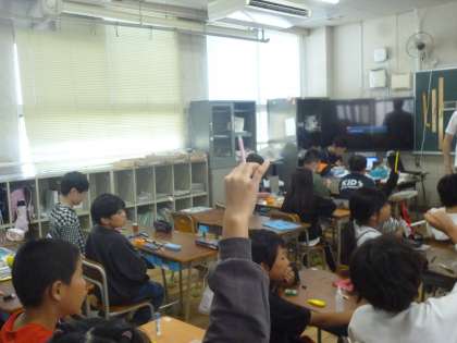 4年生は机の上に持っている文房具を並べ、C−NETの先生が英語で言う文房具があるかどうかの学習をしました。当たればうれしそうにその文房具を差し出していました。