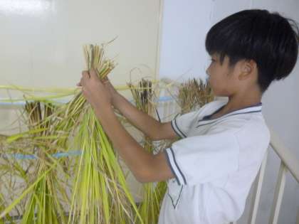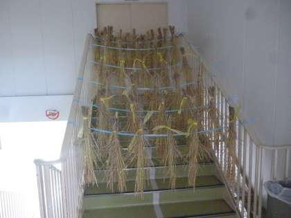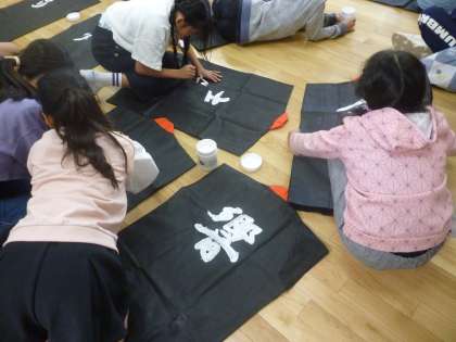 5年生は先週に刈った稲をまとめて干しています。今日は南中ソーランの法被の背中の字を仕上げていきました。