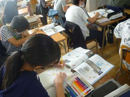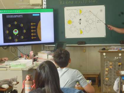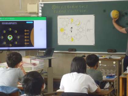 6年生は理科で月についての学習をしています。先生が月に見立てたボールで三日月や半月など、太陽の光で変化することを説明していました。